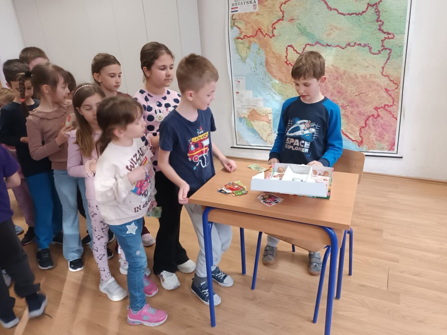 Učenici 1.b razreda imali su priliku kupovati i plaćati eurima, a u igri su sudjelovali kao kupci i prodavači. Svaki učenik dobio je određen broj slikovnih novčanica eura i kovanica centa te slike prodajnih artikala koji su bili izrezani iz kataloga. Vlastitim odabirom proizvoda odlazili su na blagajnu „platiti“ taj proizvod za koji su unaprijed trebali pripremiti novac. Učenik blagajnik preuzeo je novce i vratio ostatak. Za sve nepravilnosti u „plaćanju“ mogli su se obratiti Udruzi potrošača (učiteljica Gabriela Petranović). Učenici su uživali u igri kupovine i druženju s vršnjacima.